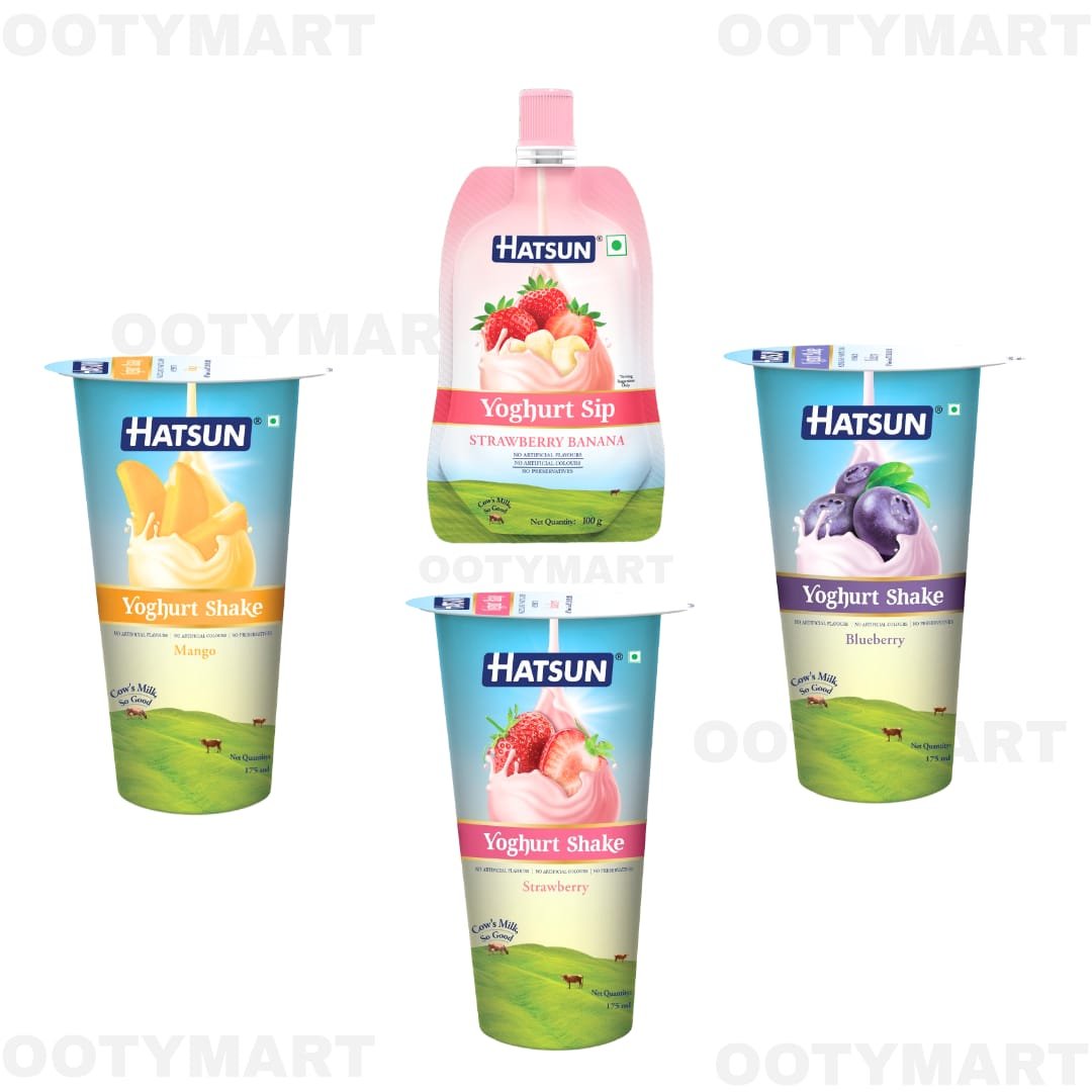 Enjoy a delicious combo of Hatsun drinks including Mango Shake, Blueberry Shake, Strawberry Banana Yoghurt Sip, and Strawberry Shake. Fresh and ready-to-drink, now available for home delivery in Ooty.