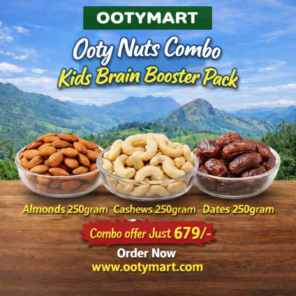 Boost your child’s nutrition with Almonds, Cashews & Dates (250g each) in Ooty Nuts Combo Kids Brain Booster Pack. Just ₹679. All India delivery available.