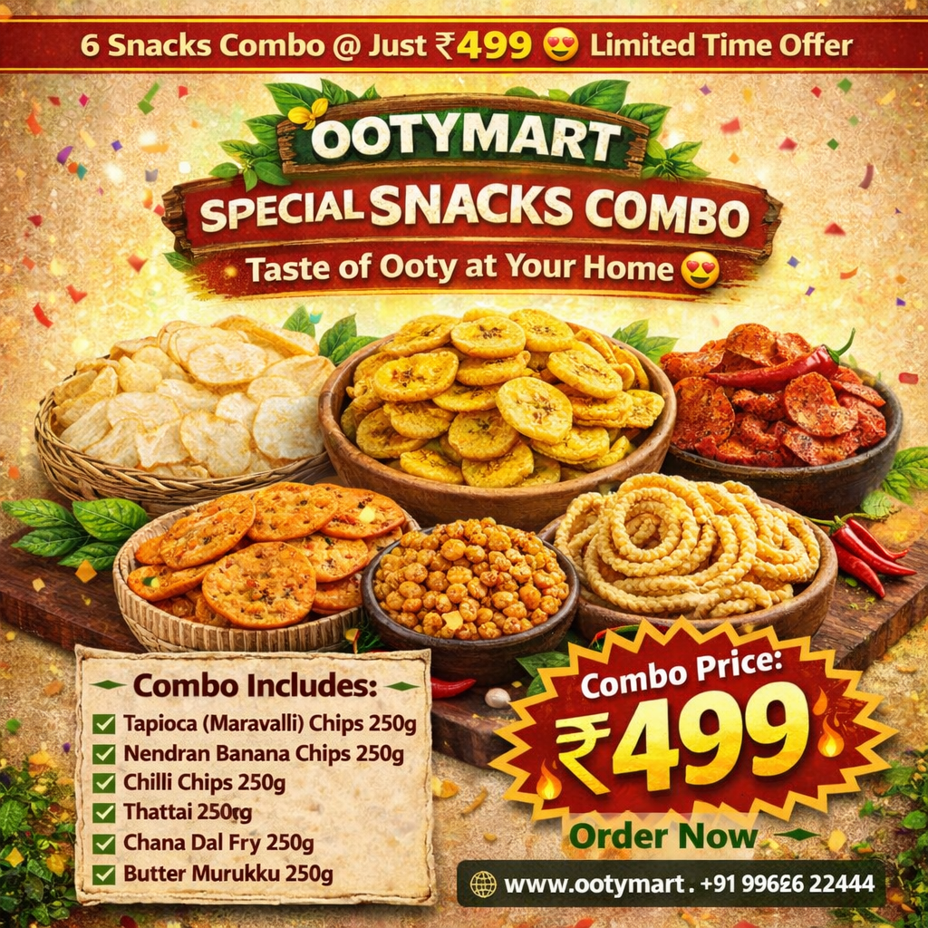 Enjoy the authentic taste of Ooty with our special snacks combo featuring tapioca chips, nendran chips, chilli chips, thattai, chana dal fry, and butter murukku. Freshly made and delivered all over India.
